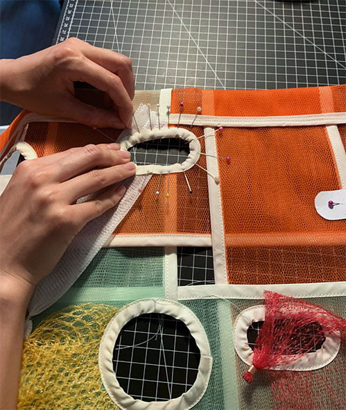 The tulle fabric is mostly transparent and when the fabrics overlap each other, new colors are created by visual mixing. Further layers of color are created by using mesh bags that are used in German supermarkets to hold vegetables and fruits. After the mesh bags were layered on top of the tulle fabric, holes in the shape of regular circles or ovals were cut out and framed with tape. Visually speaking, this creates additional gaps, which increasingly challenges the definition of clothing as protection for the body, but in fact it provides reinforcement to the gaping woven structure.